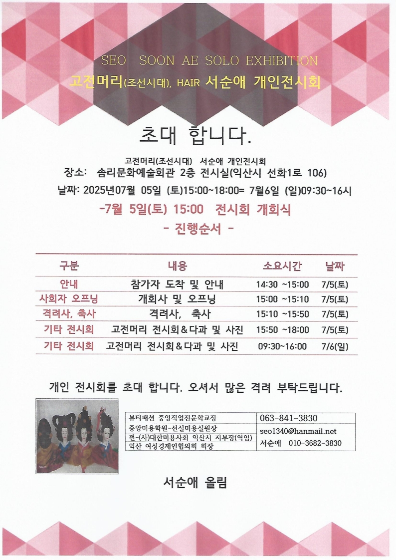 안녕하세요 이번에 좋은 기회로 솜리문화예술회관에서 7월 5일(토) 15:00~18:00, 7월 6일(일) 09:30~16:00 조선시대 고전머리 전시회를 하게되었습니다. 오셔서 많은 격려 부탁드립니다.